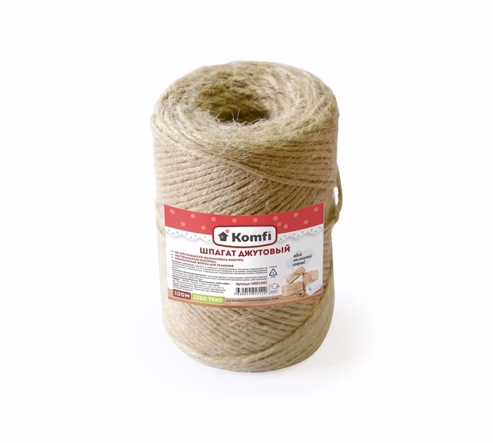 Шпагат джутовый обладает большой прочностью и отсутствием статического электричества. Наиболее популярный материал для бытовых нужд. Благодаря своей структуре он отлично вяжется и обладает малым коэффициентом трения, за счёт этого даёт прочные узлы. Поверхностный слой не осыпается при механических или иных воздействиях. Линейная плотность намотки – 1200 текс.