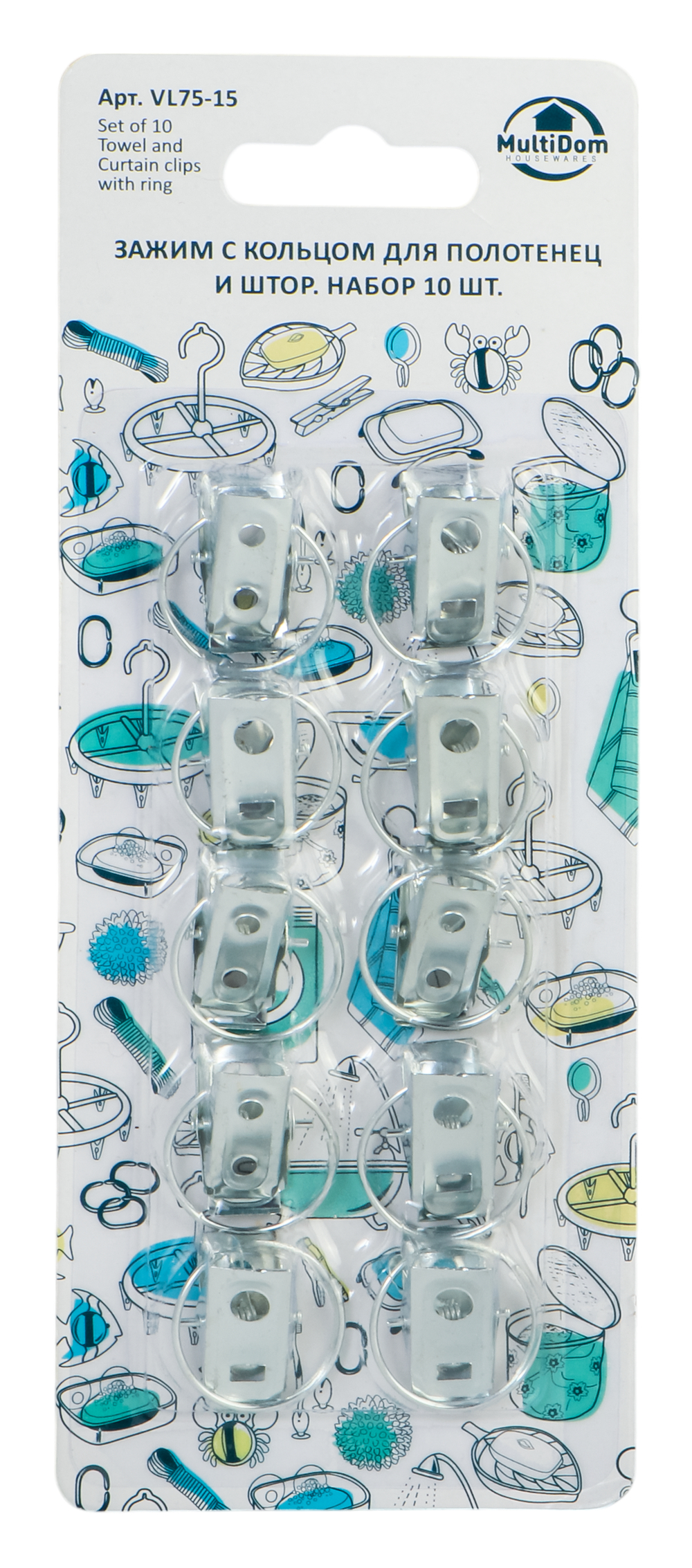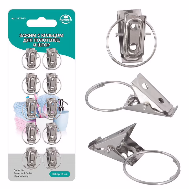 Не на всех полотенцах или шторах есть петли и могут возникать проблемы при частом использовании. Проблему решат зажимы с кольцом, которые с одной стороны зажимают изделие, а с другой подвешиваются за кольцо.
