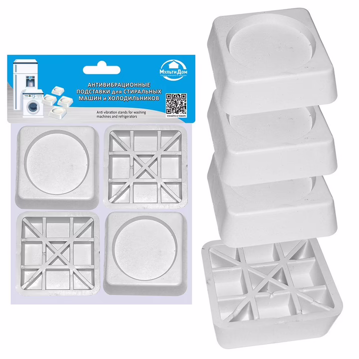 Применение подставок позволяет значительно снизить нагрузку ножек техники на напольное покрытие, керамическую плитку, деревянные полы, а также предотвращает скольжение стиральной машины при работе в режиме отжима. Снижение вибрации при работе техники достигается оптимальной антивибрационной формой подставок и использованием высокопрочного материала.