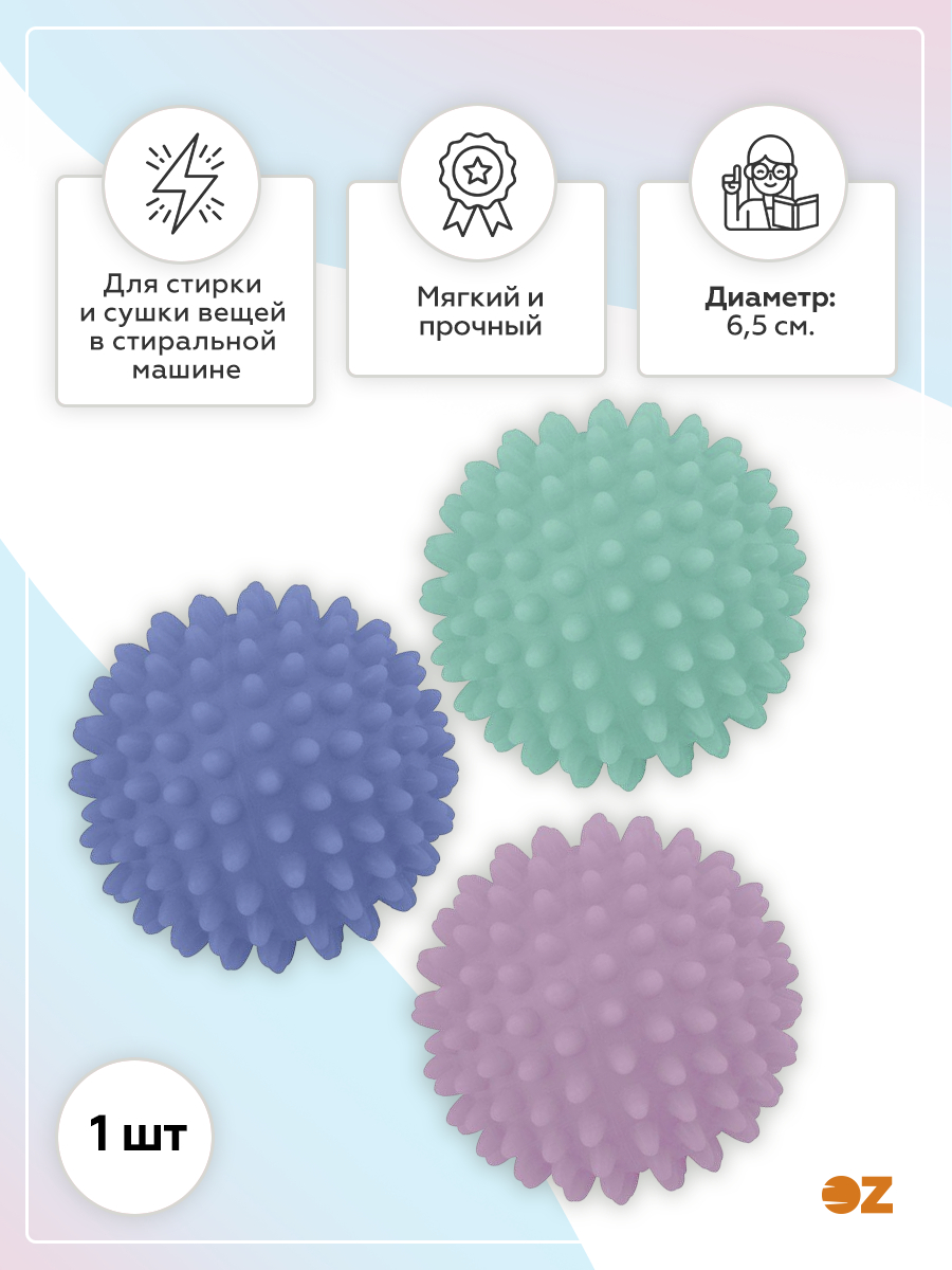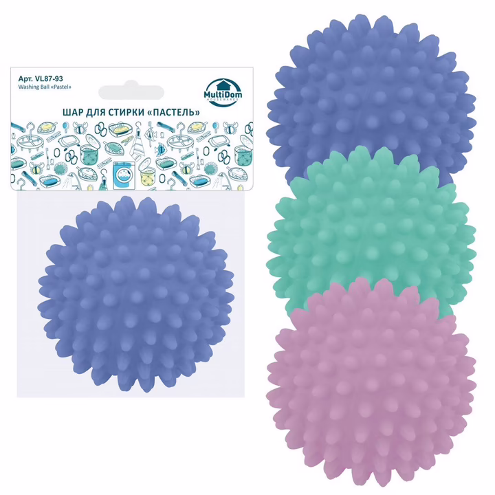 Мячик имеет специальную поверхность, благодаря которой на бельё оказывается и механическое воздействие, не хуже кондиционеров для белья. Такой мячик придаст мягкость и пушистость махровым изделиям – полотенцам, халатам и др. Изготовлен из пластмассы (поливинилхлорид).