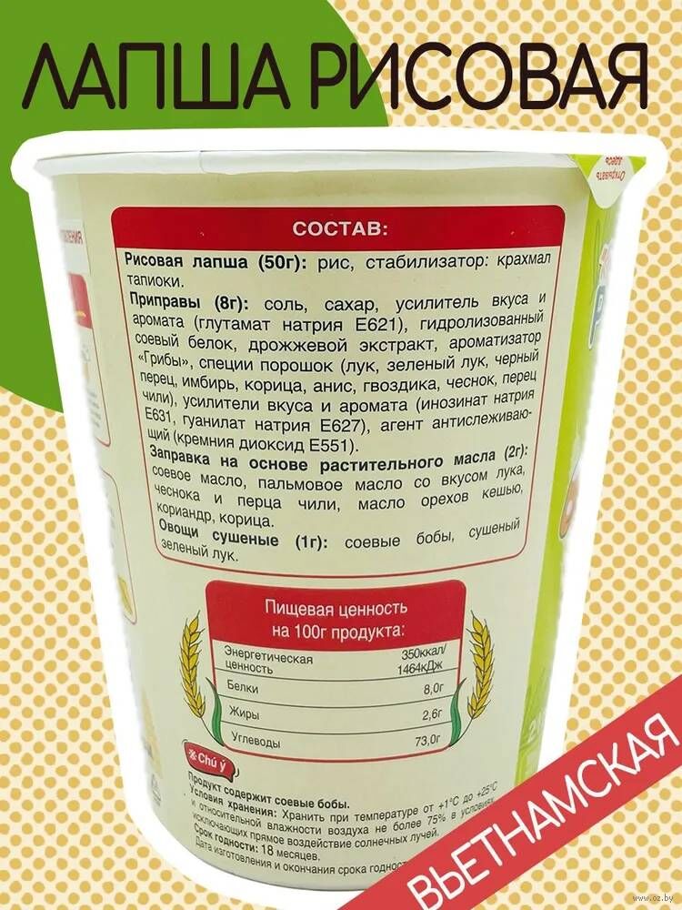 Рисовая лапша (50г): рис, стабилизатор: крахмал тапиоки.