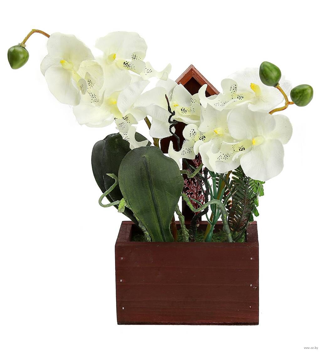 Цветочная композиция "Орхидея", в деревянном кашпо (12х6 см).