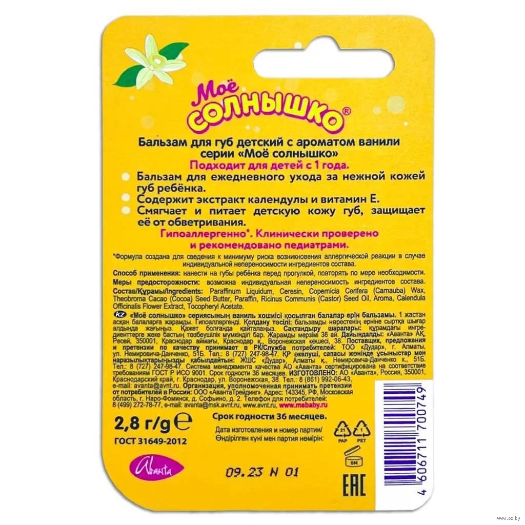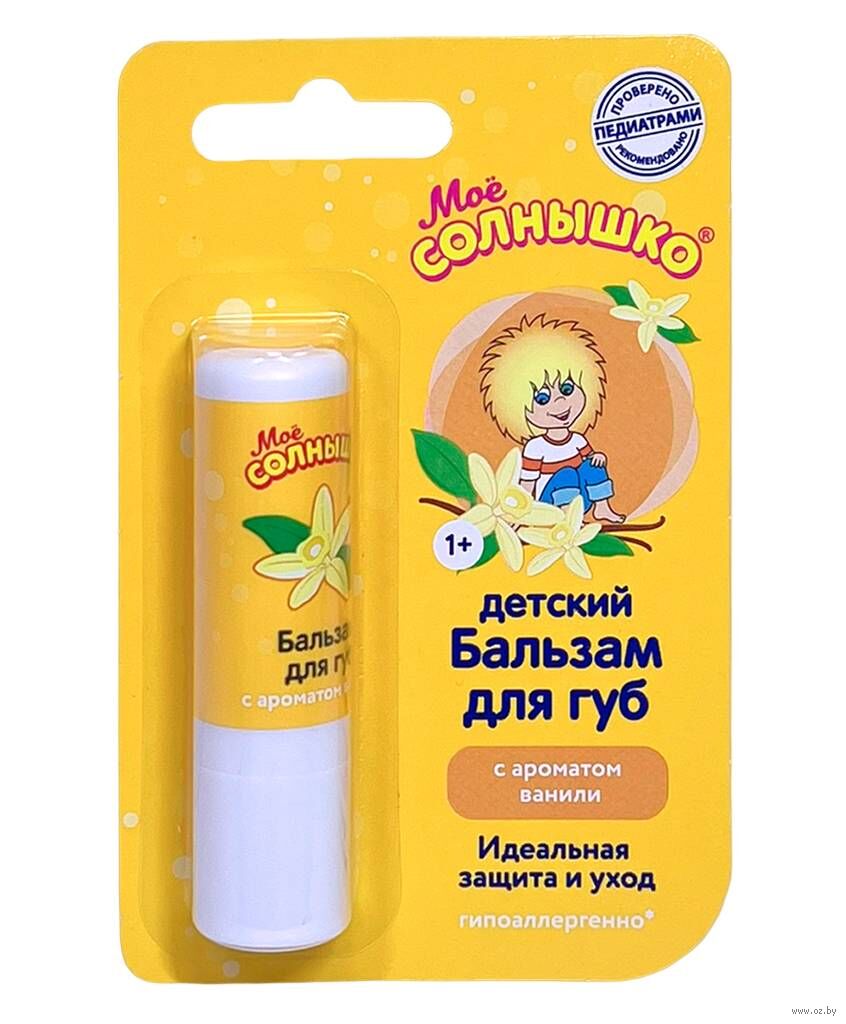 Эффективный и гипоаллергенный состав бальзама прекрасно смягчает нежную кожу губ и тщательно за ней ухаживает. Даже в непогоду кожа губ остаётся здоровой, мягкой и нежной. Приятный аромат ванили понравится и малышу, и взрослому.