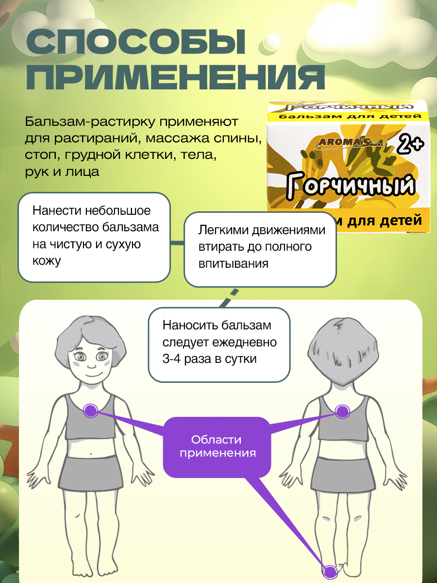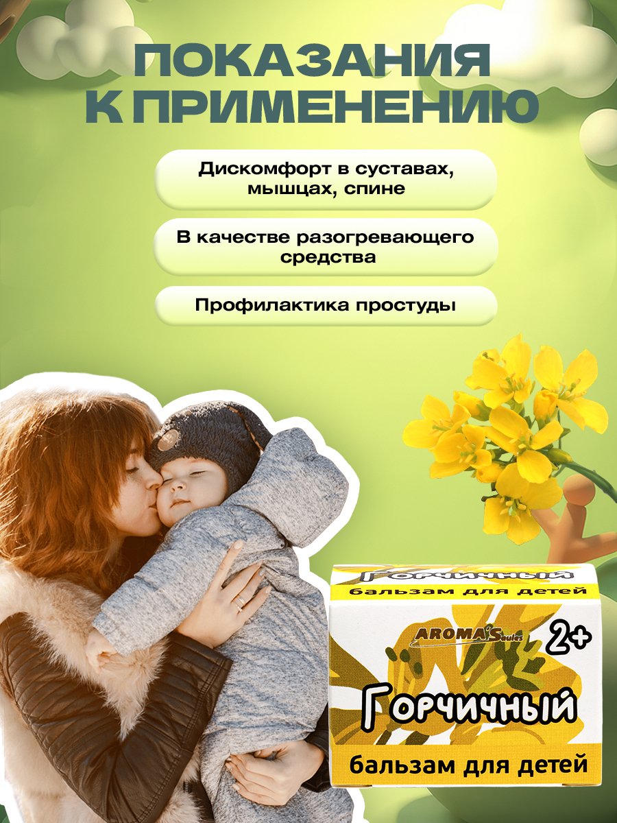 Бальзам для детей "Горчичный 2+" – прекрасное согревающее средство. В состав бальзама включены только природные и натуральные компоненты, эффективно действующие при переохлаждении. Активные ингредиенты бальзама оказывают благотворное влияние на организм. Используется для детей от 2-х лет и прекрасно подходит для взрослых с чувствительной кожей.