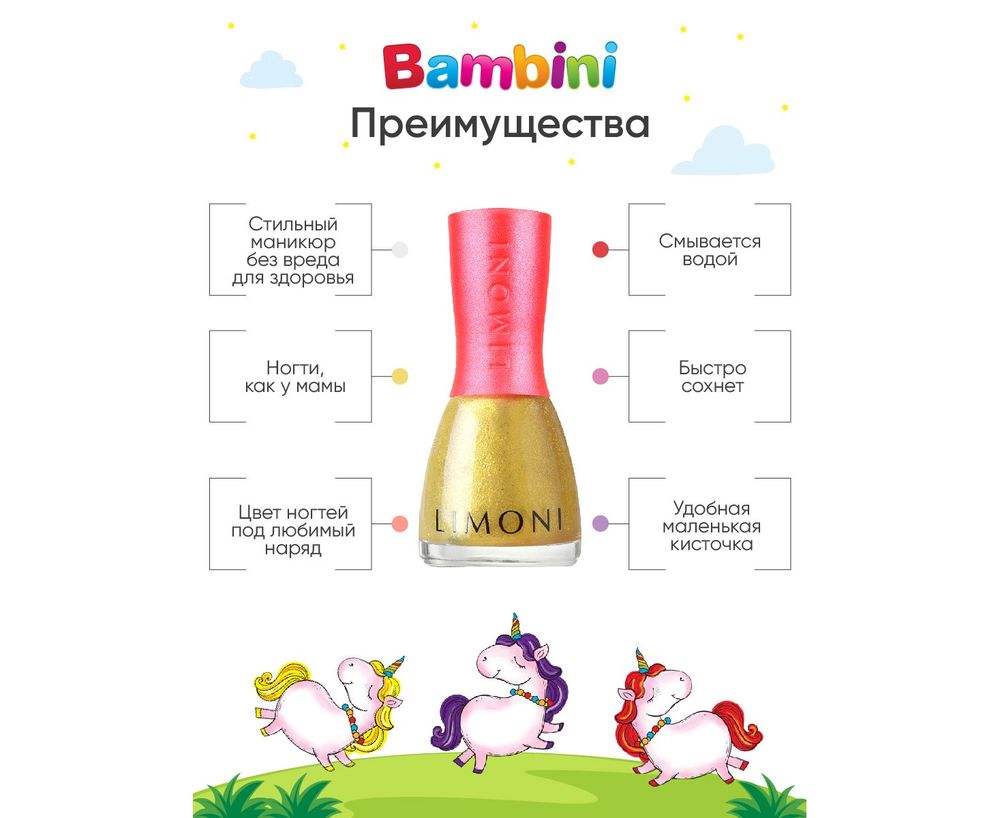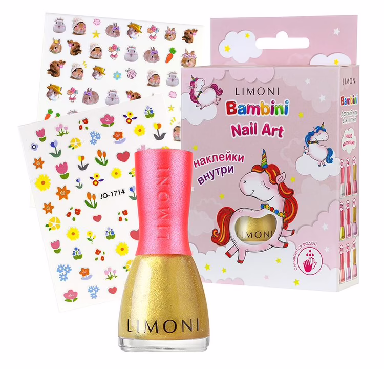 Набор состоит из безопасного лака для ногтей на водной основе "Bambini", который позволит маленьким принцессам красить ногти без опасения за здоровье, а также 2 листов с разными наклейками. Наклейки имеют клеевую основу и не требуют замачивания, делая процесс создания стильного маникюра лёгким и интересным.