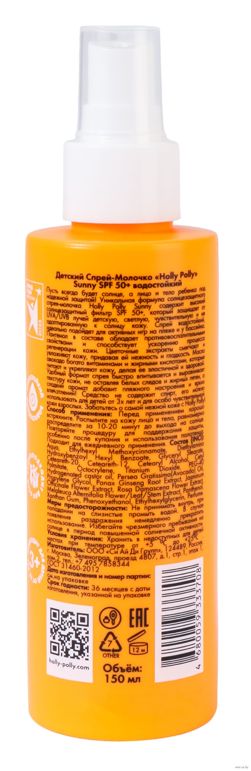 Уникальная формула солнцезащитного спрея "Holly Polly Sunny" содержит высокий солнцезащитный фильтр SPF 50+, который защищает от UVA/UVB лучей, неблагоприятных факторов окружающей среды, борется с фотостарением и появлением пигментных пятен.