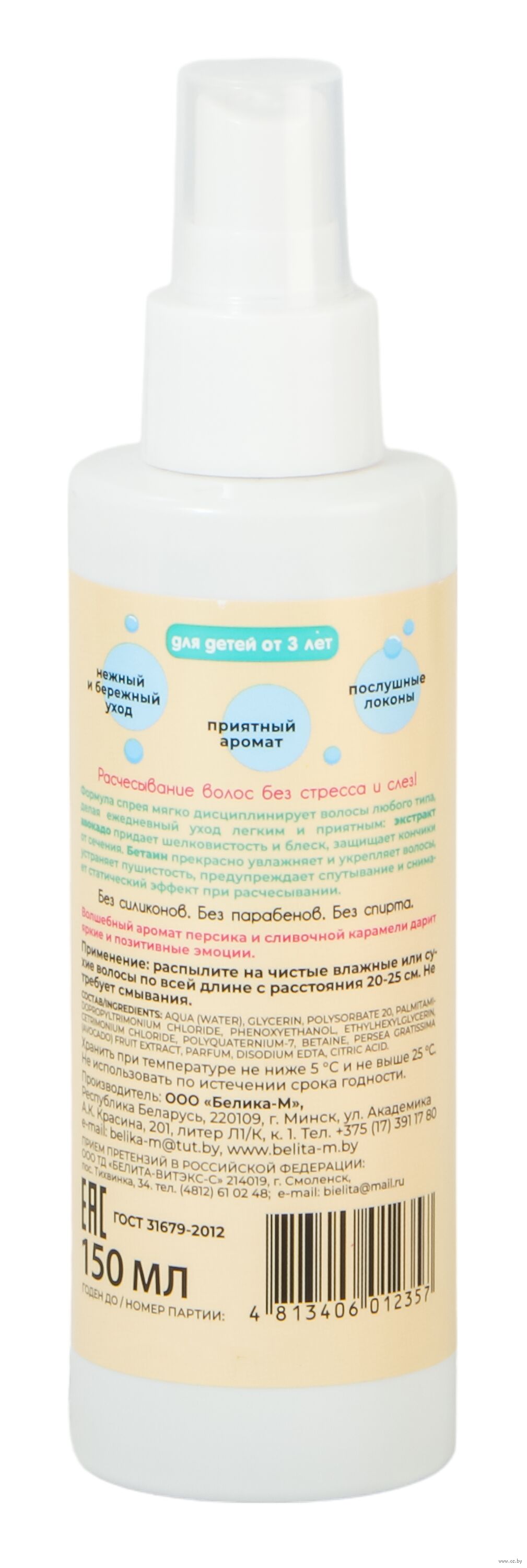 Формула спрея мягко дисциплинирует волосы любого типа, делая ежедневное расчесывание легким и приятным, а волшебный аромат персика и сливочной карамели дарит яркие и позитивные эмоции. Без силиконов. Без парабенов. Без спирта.