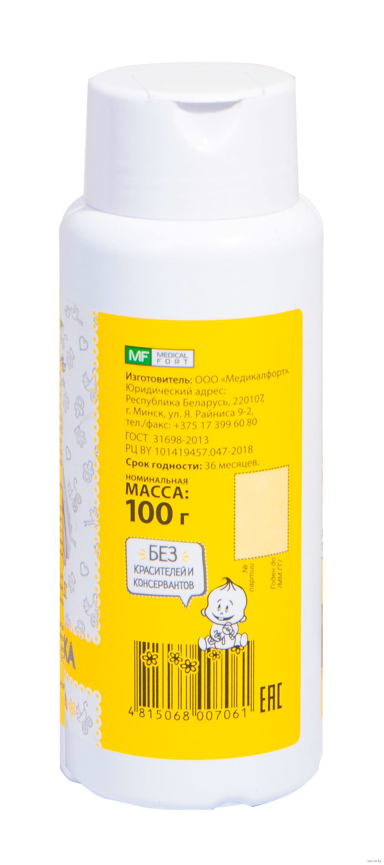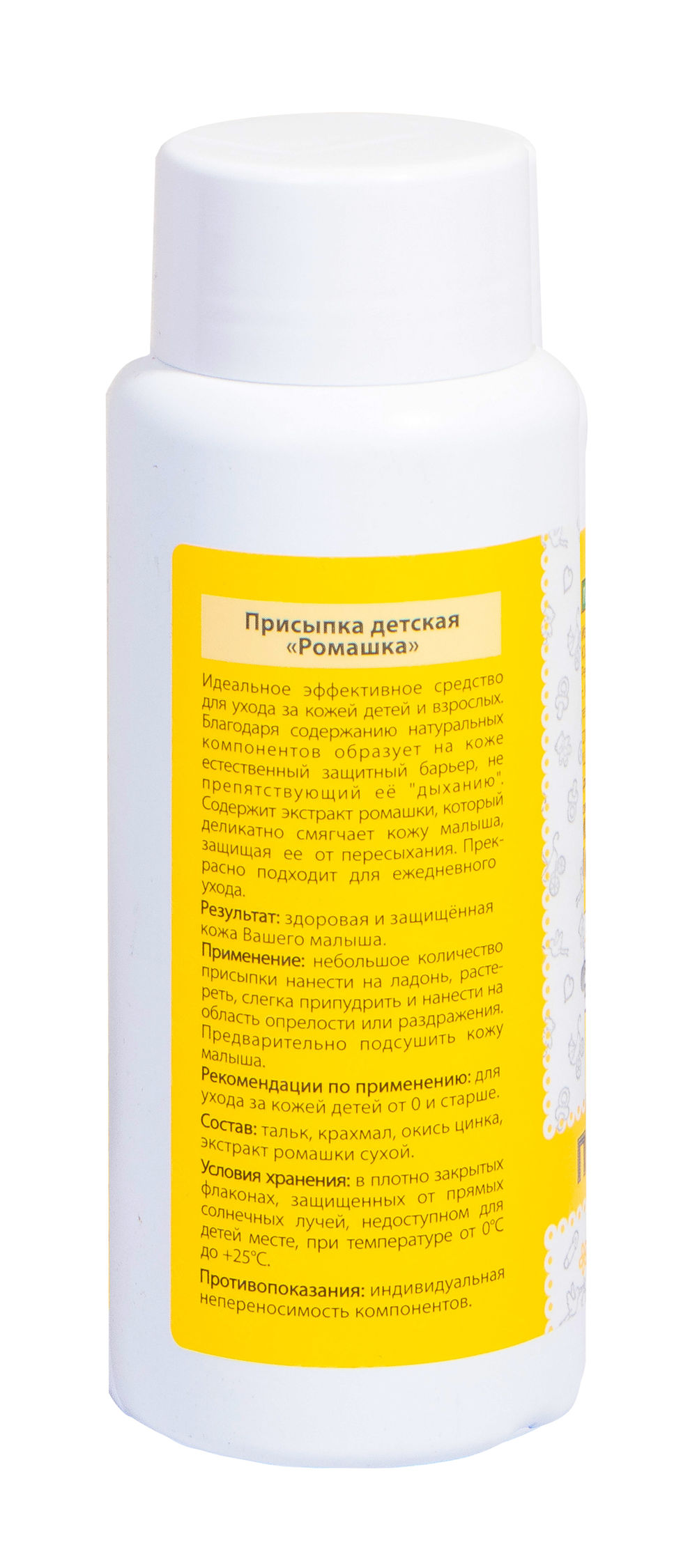 Присыпка детская "Ромашка" – идеальное эффективное средство для ухода за кожей детей и взрослых. Благодаря содержанию натуральных компонентов образует на коже естественный защитный барьер не препятствующий ее "дыханию". Содержит экстракт ромашки, который деликатно смягчает кожу малыша, защищая её от пересыхания. Прекрасно подходит для ежедневного ухода. Не содержит красителей и консервантов.