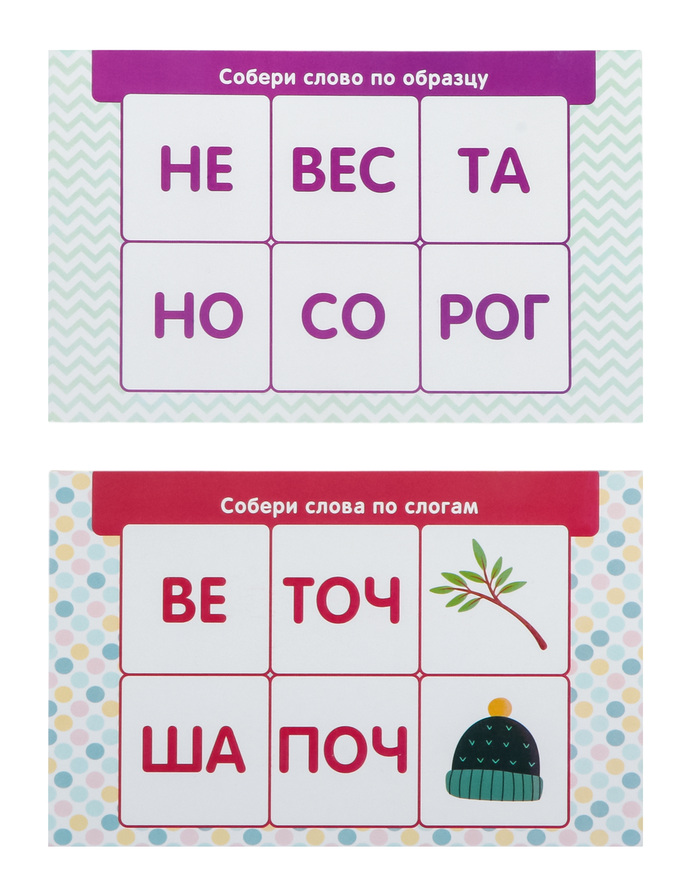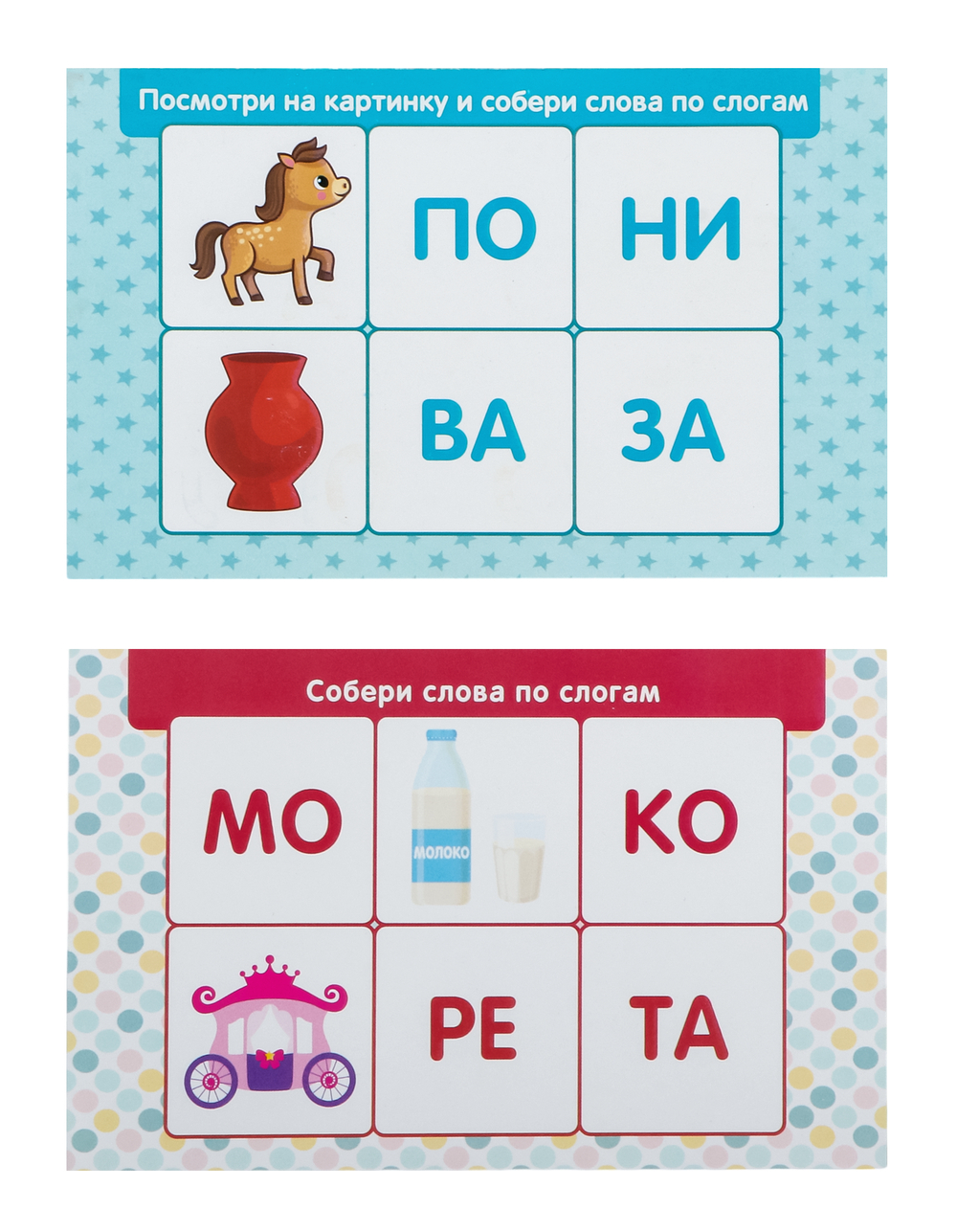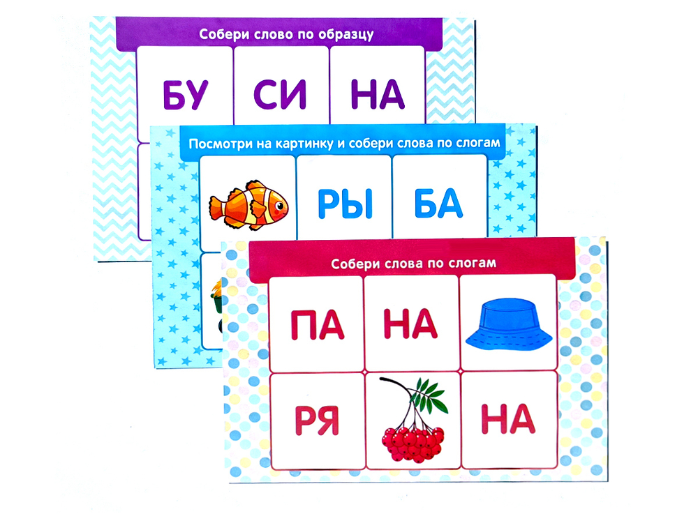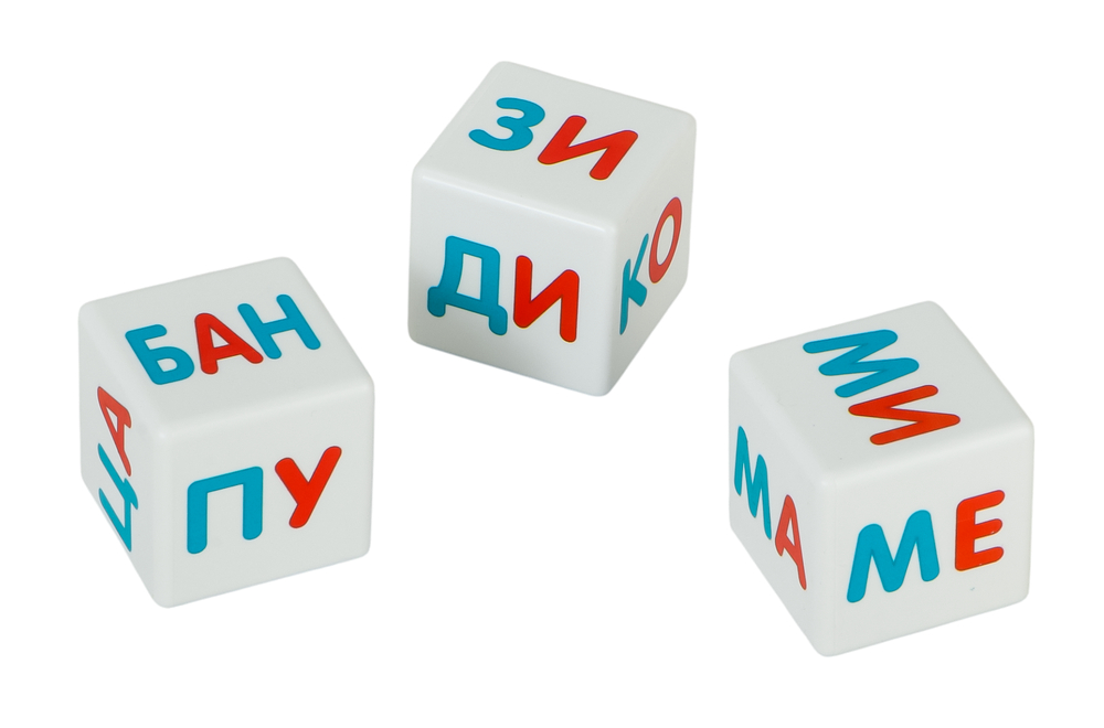 Слоги нанесены на кубики методом прямой полноцветной печати (без обклейки). Для безопасности у кубиков абсолютно гладкая поверхность и закругленные края.