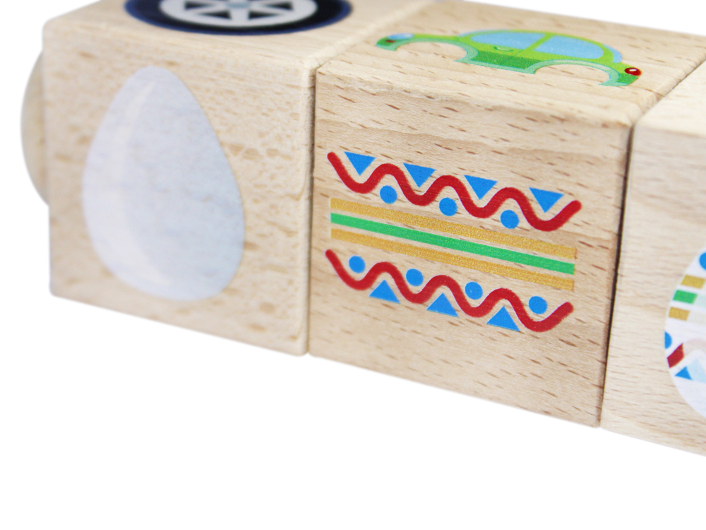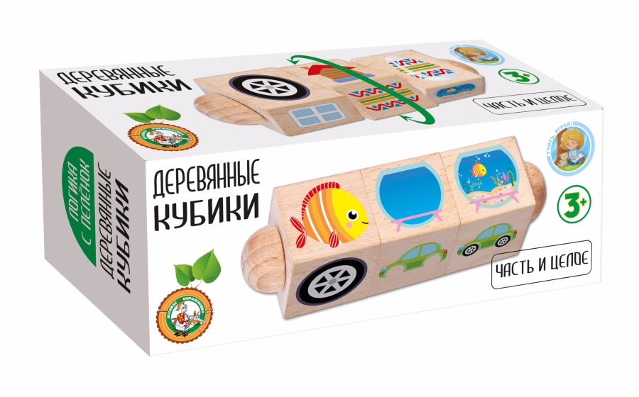 Деревянные кубики на оси "Часть и целое" для детей от 3-х лет изготавливаются из экологического материала – массива дерева. Изображения наносятся на кубик с применением технологии прямой печати, что обеспечивает износостойкость игрушки.