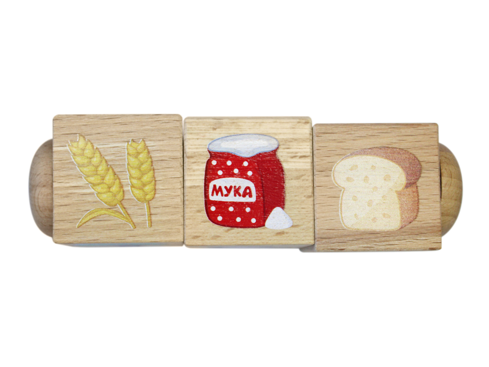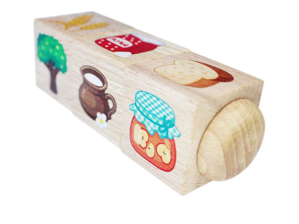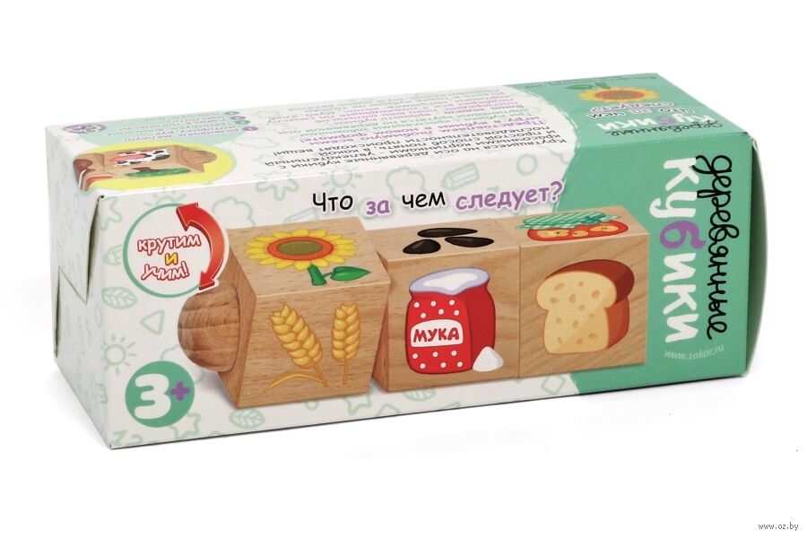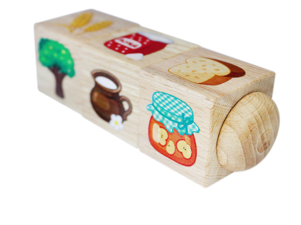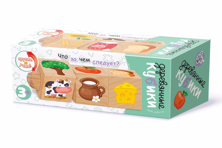 Деревянные кубики на оси «Что за чем следует» для детей от 3-х лет изготавливаются из экологического материала – массива дерева. Изображения наносятся на кубик с применением технологии прямой печати, что обеспечивает износостойкость игрушки.