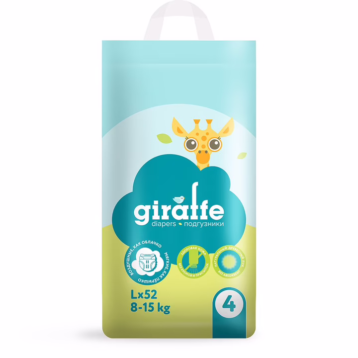 Подгузники легендарной серии Giraffe – это практичность, безопасность и высокий уровень комфорта для малыша. Подгузники предлагают всё самое необходимое – моментальную впитываемость и удержание большого количества жидкости, максимальный комфорт и безопасность. Мельчайшие кристаллы Waterlock впитывают большое количество жидкости даже под давлением массы тела, когда малыш лежит или сидит.