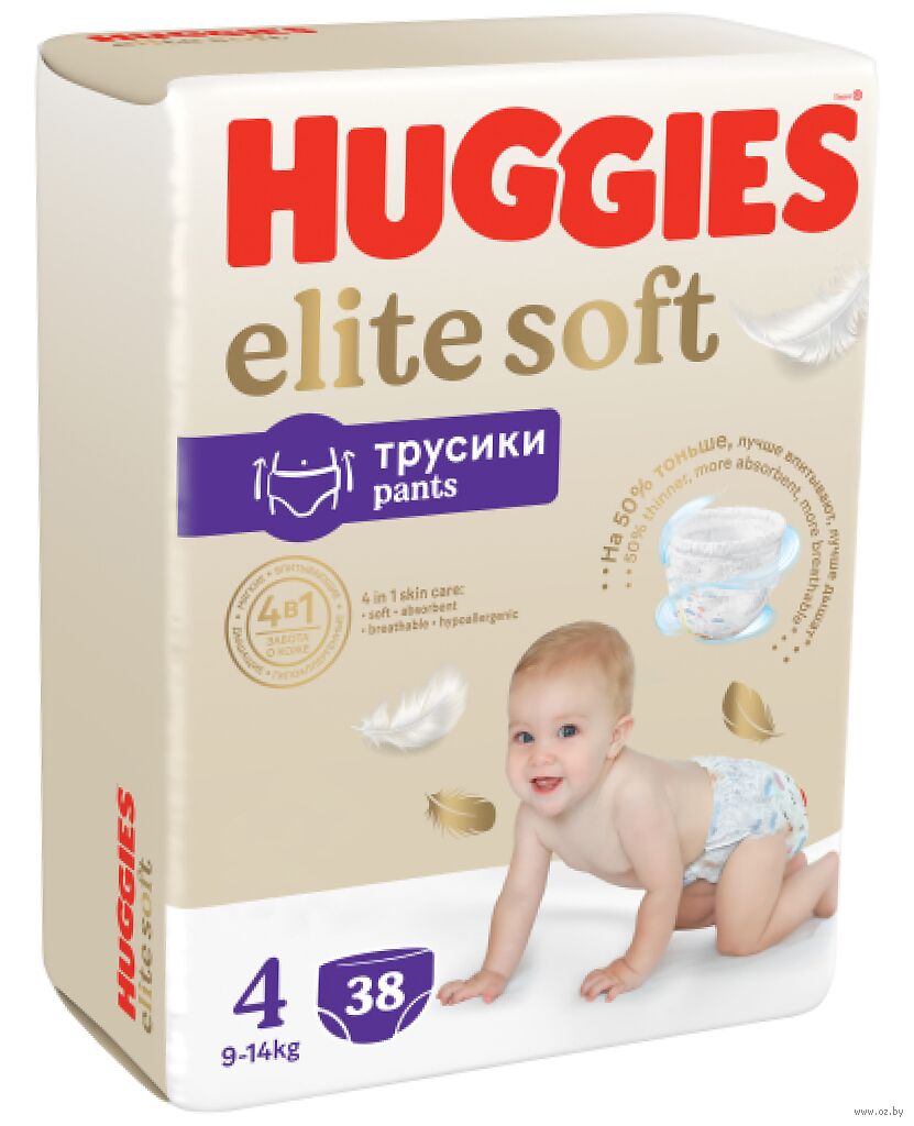 Подгузники-трусики детские одноразовые Huggies Elite Soft 4 (9-14 кг), 38 штук – нежные, мягкие и дышащие трусики для мальчиков и девочек.