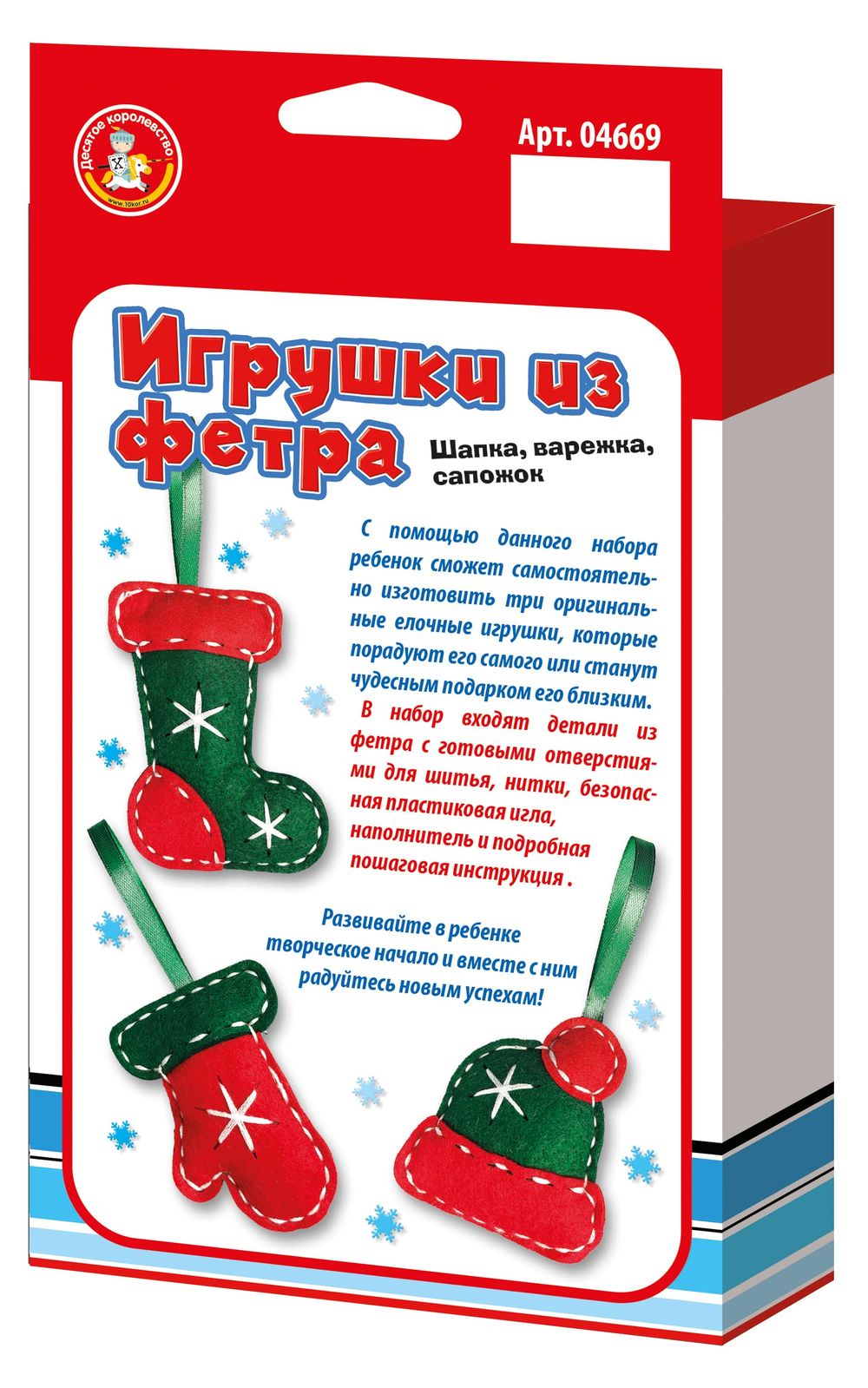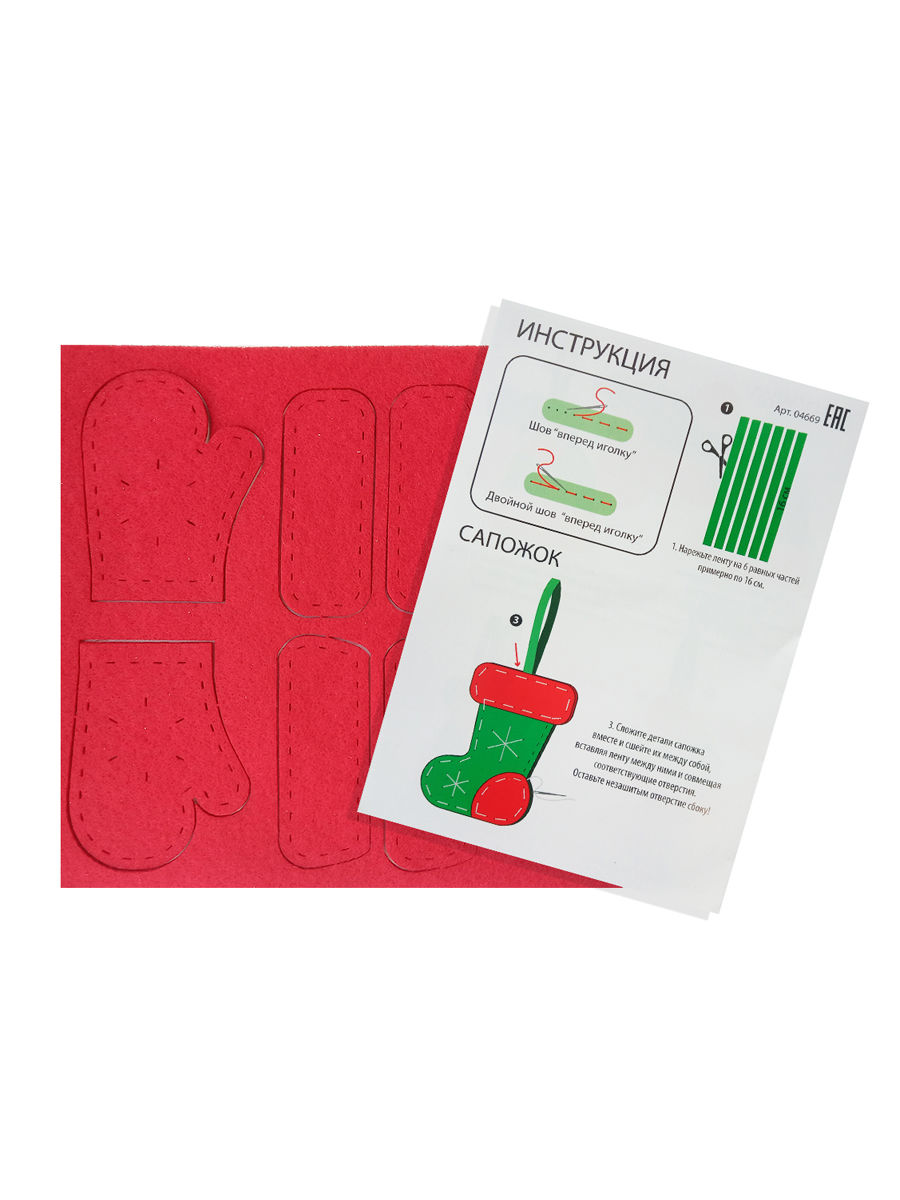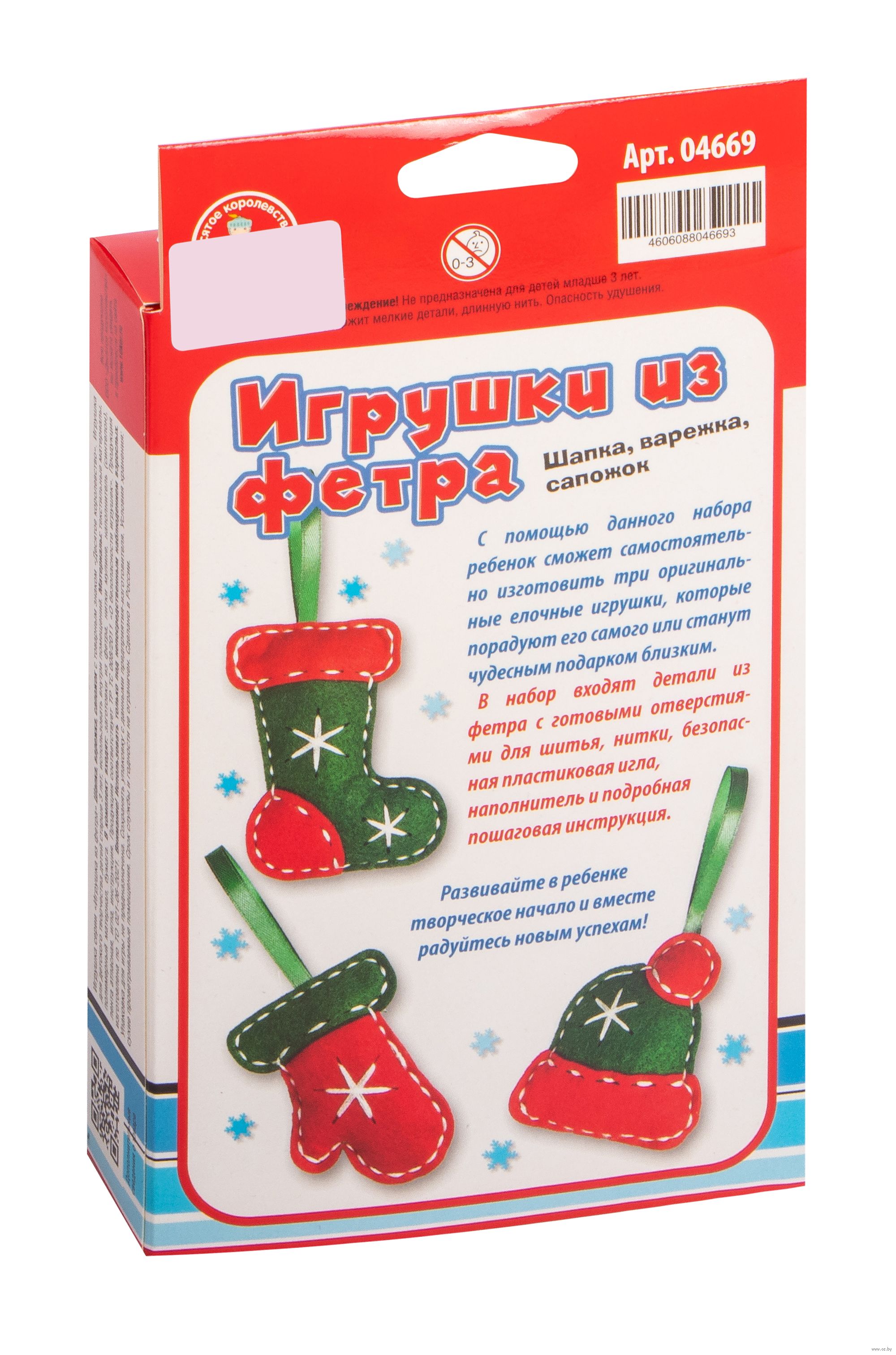 С набором для детского творчества "Игрушки из фетра" можно своими руками сделать елочные игрушки из фетра в виде шапки, варежки и сапожка в традиционном новогоднем стиле.