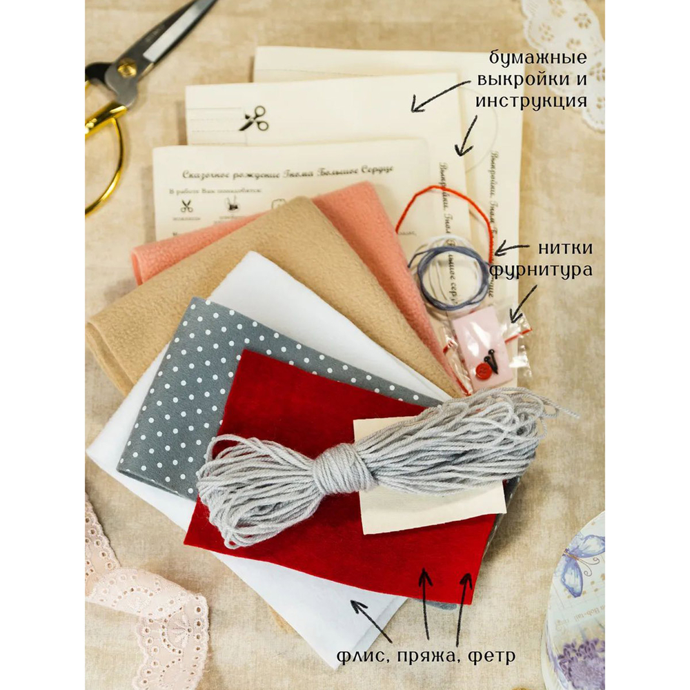 В набор для самостоятельного создания куклы входит все необходимое: флис, фетр, трикотаж, фурнитура, выкройки и инструкция.
