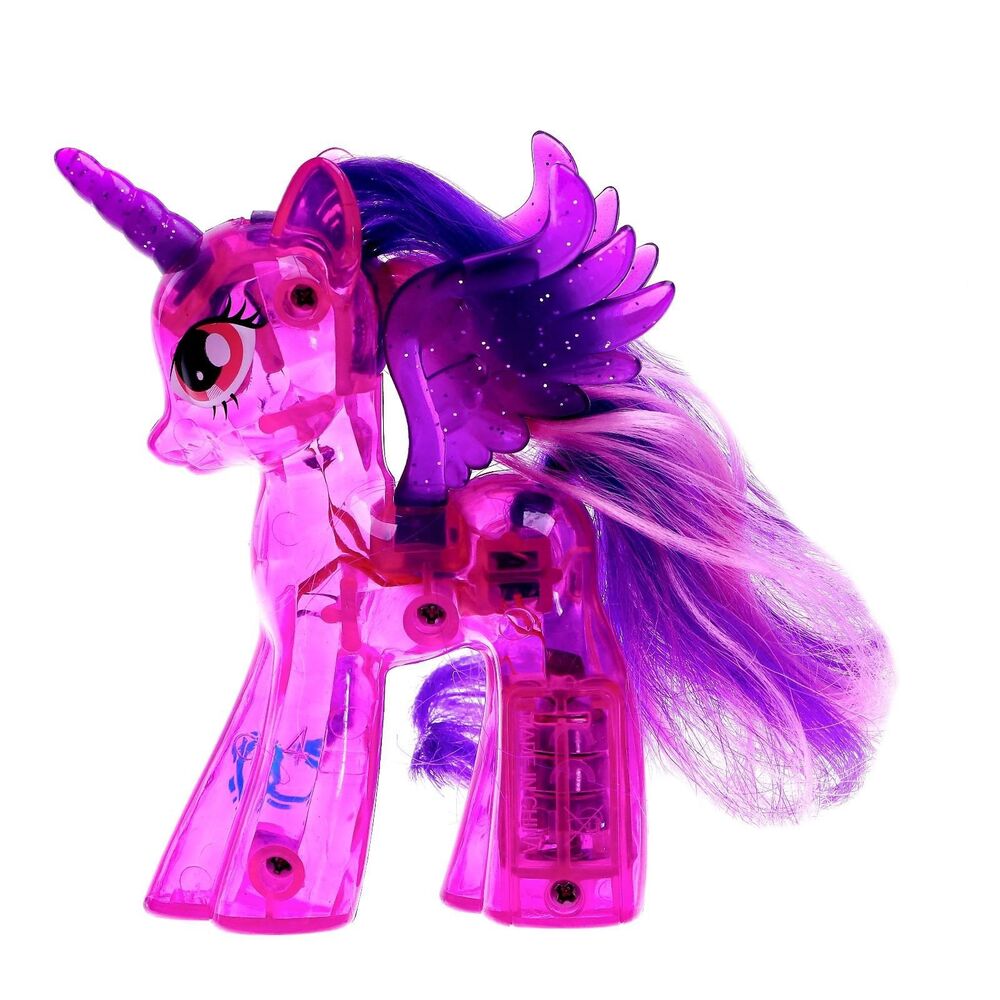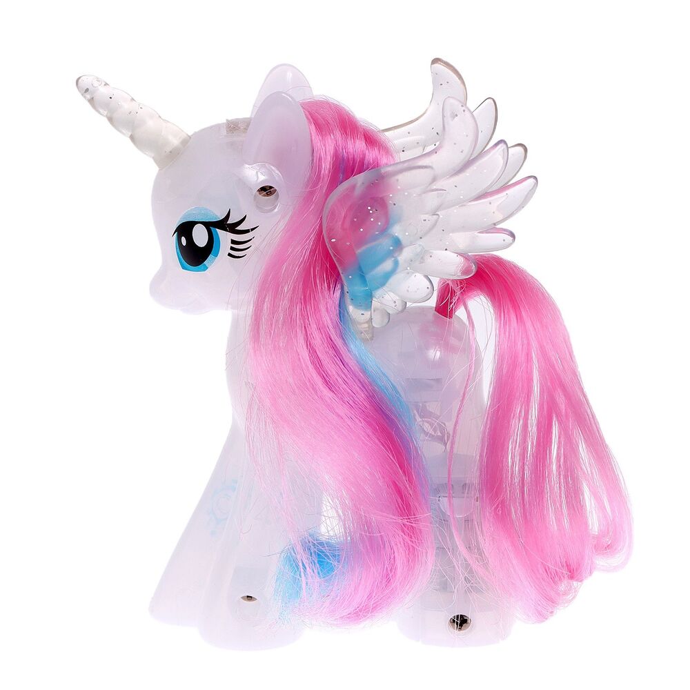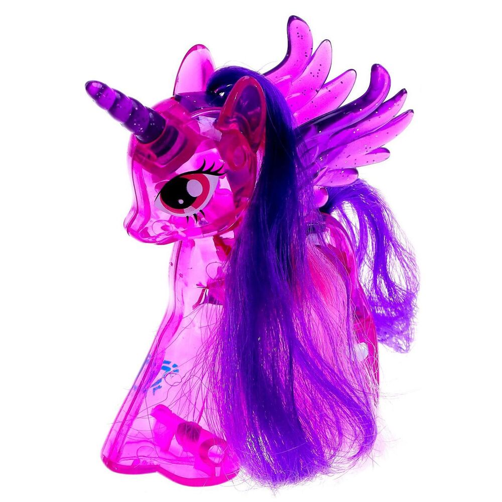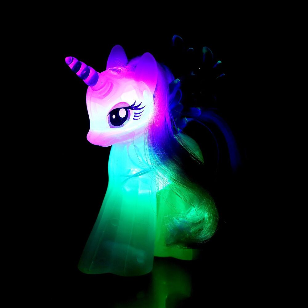 Пони начнёт светиться, стоит вам нажать кнопку. Яркими огонёчками она будет радовать вашу малышку.