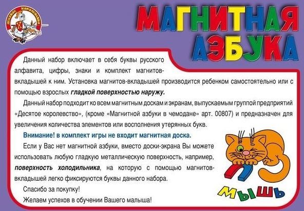 Набор магнитов "Набор букв русского алфавита" включает в себя буквы русского алфавита, цифры, знаки и комплект магнитов-вкладышей к ним. Установка магнитов-вкладышей производится ребёнком с помощью взрослых гладкой поверхностью наружу.