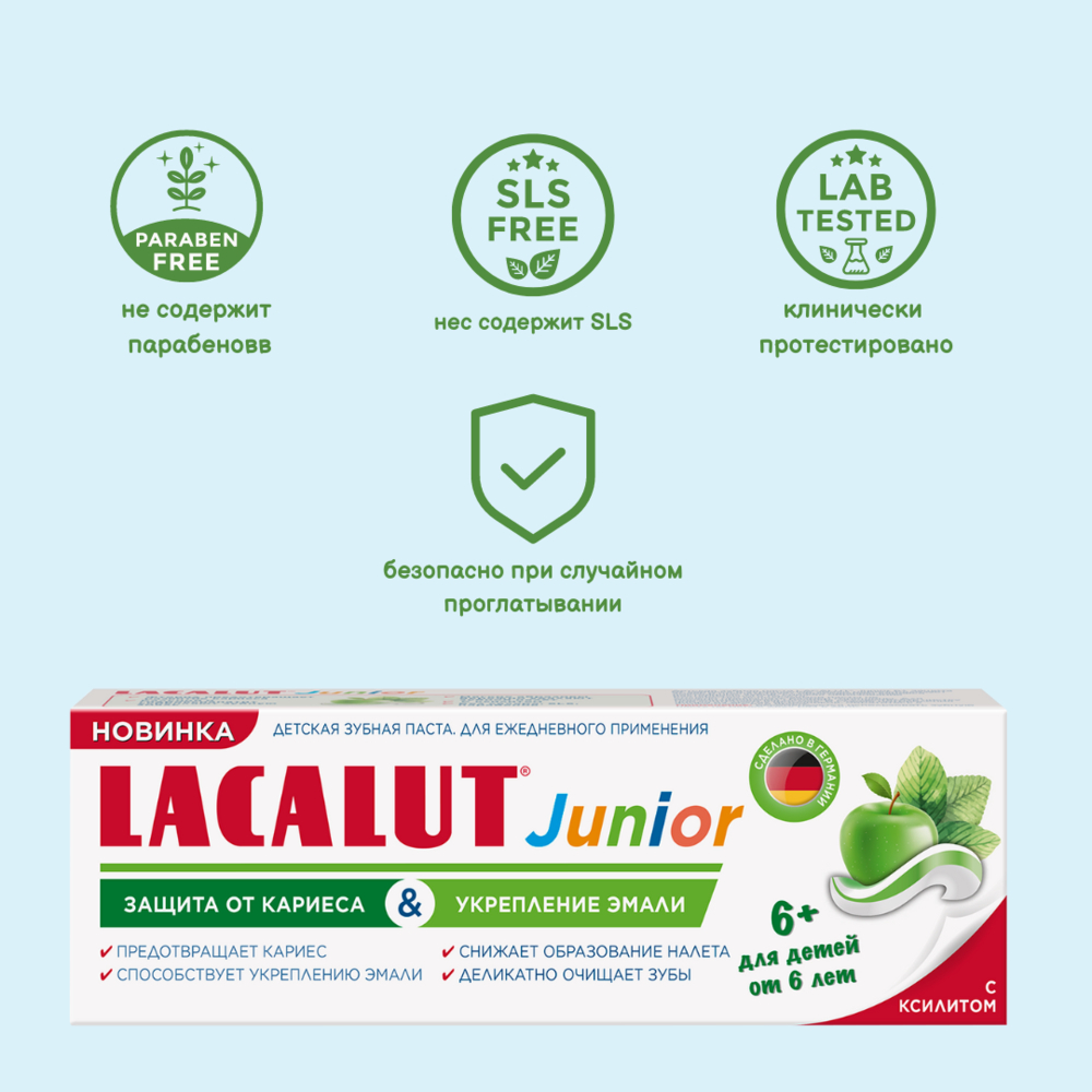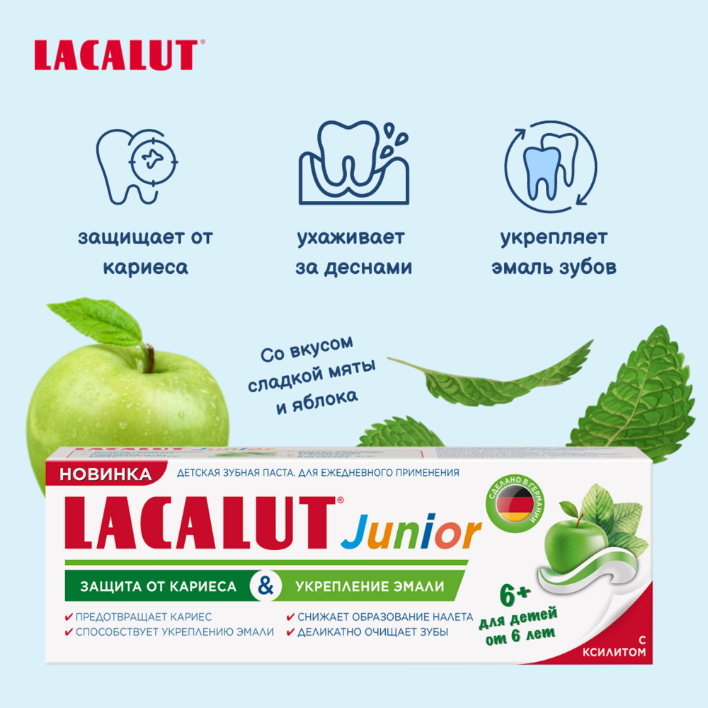 Свежий вкус яблока и мяты нравится детям. Фторид и ксилит реминерализуют эмаль и препятствуют образованию кариеса постоянных зубов, снижая образование бактериального налета.