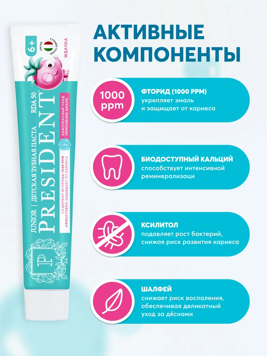 Детская зубная паста "Жвачка" 6+ лет обеспечивает защиту от кариеса, укрепление эмали и эффективное очищение.