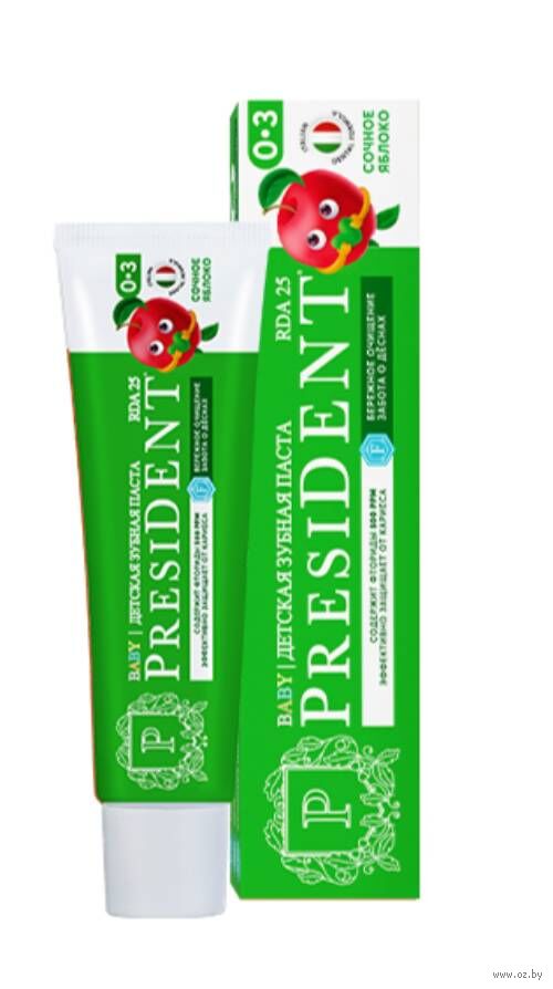 Детская зубная паста PRESIDENT "Сочное яблоко" от 0 до 3 лет обеспечивает защиту от кариеса, заботу о деснах, укрепление эмали и бережное очищение.