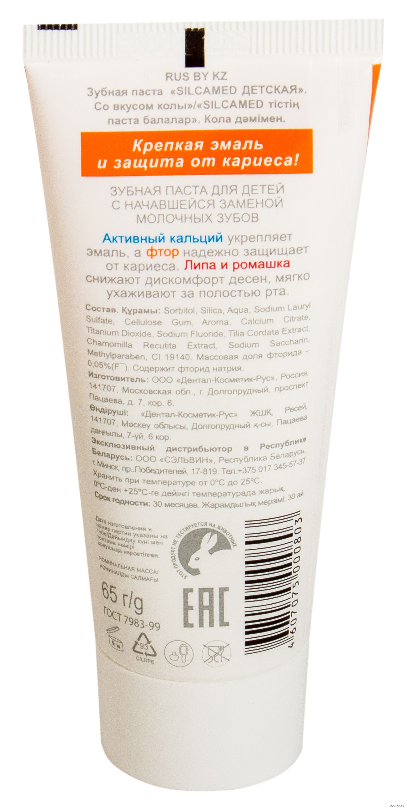 Sorbitol, Silica, Aqua, Sodium Lauryl Sulfate, Cellulose Gum, Aroma, Calcium Citrate, Titanium Dioxide, Sodium Fluoride, Tilia Cordata Extract, Chamomilla Recutita Extract, Sodium Saccharin, Methylparaben, CI 19140. Массовая доля фторида – 0,05%(F¯).