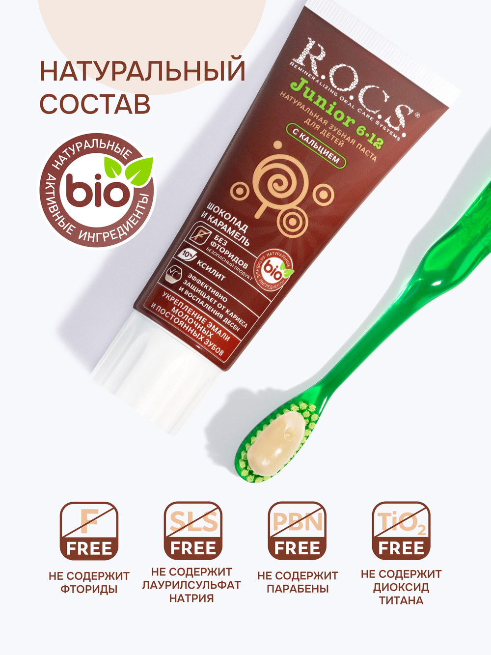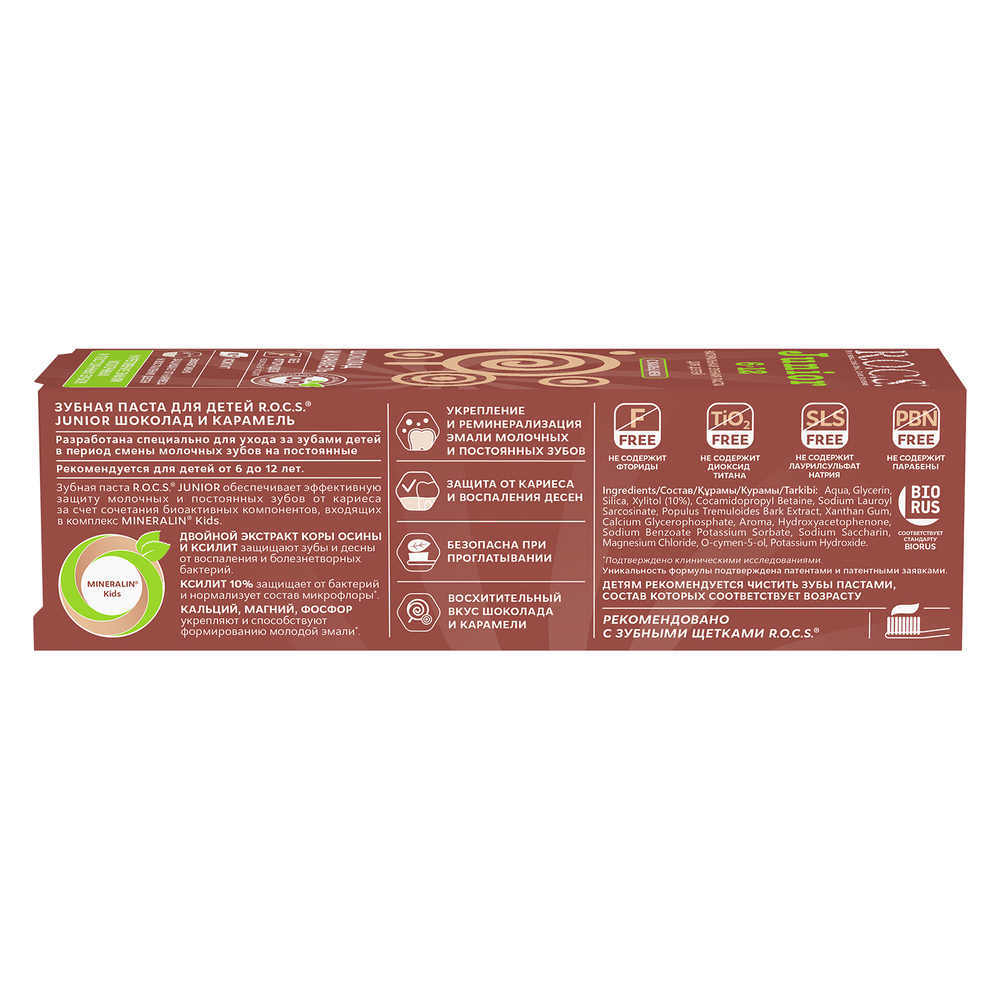 Зубная паста R.O.C.S.® Junior обеспечивает эффективную защиту молочных и первых постоянных зубов от кариеса за счет сочетания биоактивных компонентов, входящих в комплекс Mineralin® Kids. Двойной экстракт коры осины и ксилит защищают зубы и десны от воспаления и болезнетворных бактерий. Ксилит 10% защищает от бактерий и нормализует состав микрофлоры*. Кальций, магний, фосфор укрепляют и способствуют формированию молодой эмали*.