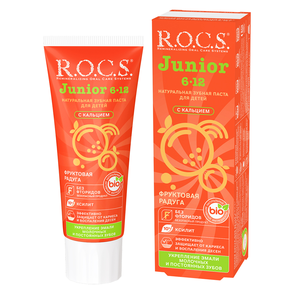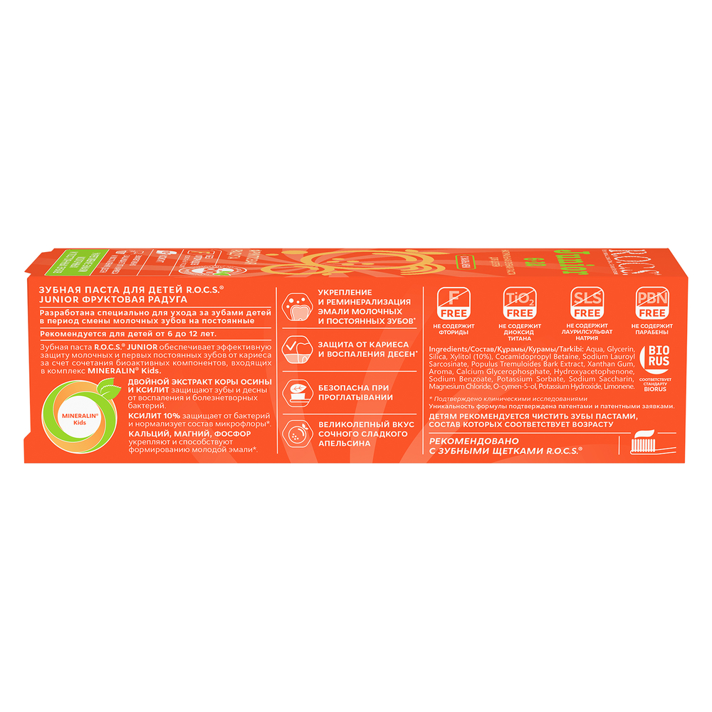 Зубная паста R.O.C.S.® Junior обеспечивает эффективную защиту молочных и постоянных зубов от кариеса за счет сочетания биоактивных компонентов, входящих в комплекс Mineralin® Kids. Двойной экстракт коры осины и ксилит защищают зубы и десны от воспаления и болезнетворных бактерий. Ксилит 10% защищает от бактерий и нормализует состав микрофлоры*. Кальций, магний, фосфор укрепляют и способствуют формированию молодой эмали*.