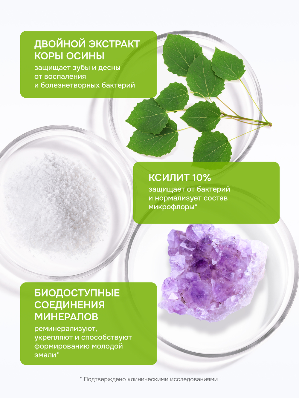 | Особенности | Без красителей, без фтора, с ксилитом |