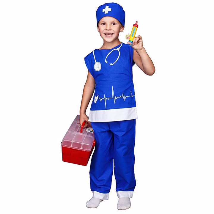 В комплекте имеется форма медика – накидка со штанами и колпаком. Образ доктора дополняют различные игрушечные аксессуары: стетоскоп, градусник, шприц, а также очки.