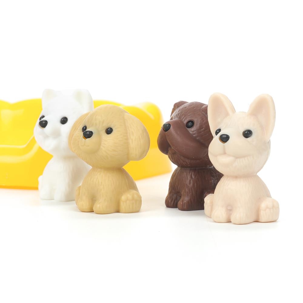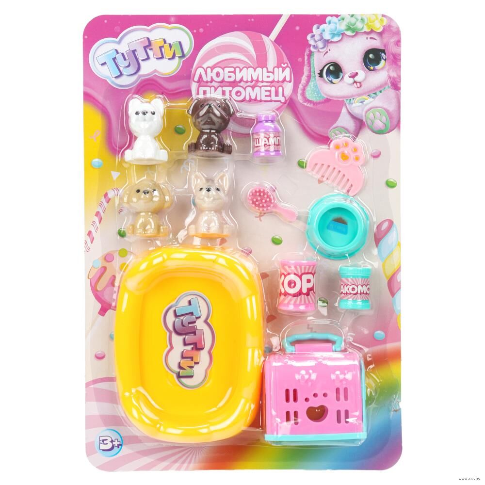 В комплекте: 4 собачки, 8 аксессуаров: корм, лакомство, шампунь, миска, расчёска-щётка, расчёса-гребень, переноска, лежанка.