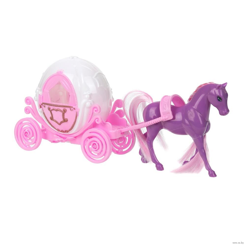 Этот интересный набор непременно понравится вашей девочке и вдохновит её на увлекательные сюжеты для игр. Она с удовольствием будет ухаживать за гривой и хвостом милого пони, а также устраивать для своих любимых маленьких куколок прогулки в красивой карете, достойной королевских особ.