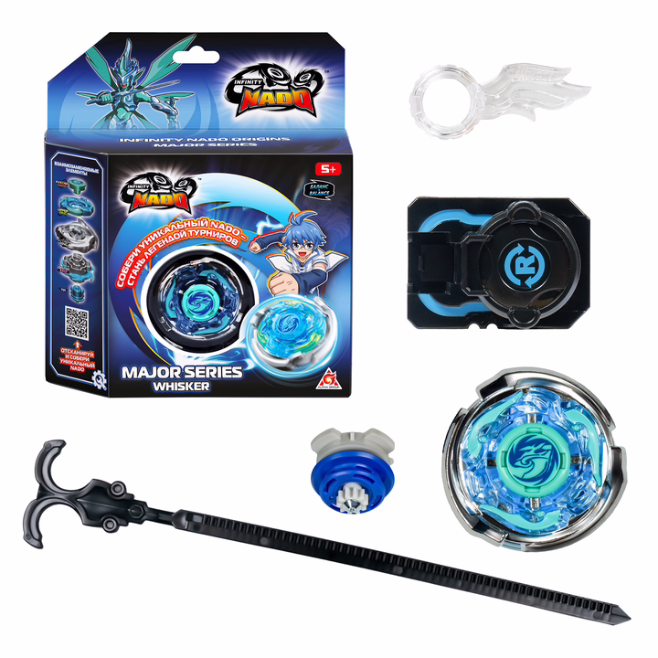 Металлический волчок Infinity Nado "Мэйджор Whisker Небесный Вихрь" состоит из пяти частей: аватара Nado, верхнего и атакующего колец, центральной оси и наконечника. Он принадлежит Джину и отличается превосходным балансом, благодаря которому уверенно удерживает равновесие на арене.