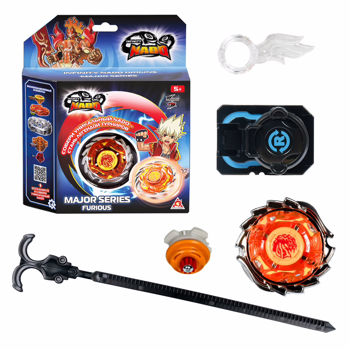 Металлический волчок Infinity Nado "Мэйджор Furious Сияющий огонь" состоит из пяти частей: аватара Nado, верхнего и атакующего колец, центральной оси и наконечника. Он принадлежит Дону и отличается усиленной атакой, позволяя наносить мощные удары сопернику на арене.