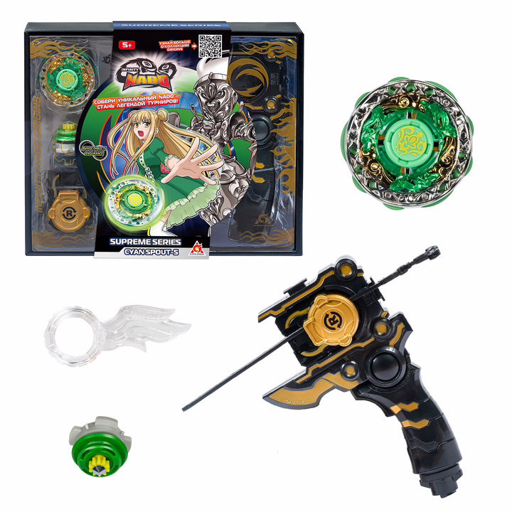 Металлический волчок Infinity Nado "Суприм Cyan Spout Неоновый смерч" принадлежит Сесилии и состоит из пяти частей: аватара Nado, верхнего кольца, тройного атакующего кольца, оси и наконечника. Главным его свойством является выносливость, что позволяет ему вращаться на арене дольше волчков соперников.