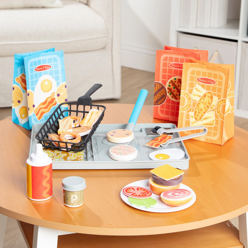 Готовьте гамбургер, овощной бургер или блинчики на гриле или сковороде, при переворачивании нажмите на ручку лопатки, чтобы полилась вода, и наблюдайте, как меняется цвет по мере того, как еда волшебным образом "готовится"! Налейте воду во фритюрницу и выложите курицу, луковые кольца и картофель фри в корзину для жарки, чтобы "прожарить" больше вкусностей. Соберите бургер, добавив овощи, приправы и булочки, на которых проявятся кетчуп и горчица, если капнуть водой из бутылочки. Подавайте блюда на тарелке или упакуйте с собой в фетровые пакетики. Чтобы играть снова и снова, дайте игрушкам высохнуть.