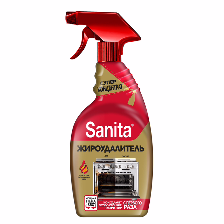 Спрей- Жироудалитель SANITA GOLD – супермощное средство мгновенного действия для удаления особо сложных жировых загрязнений.