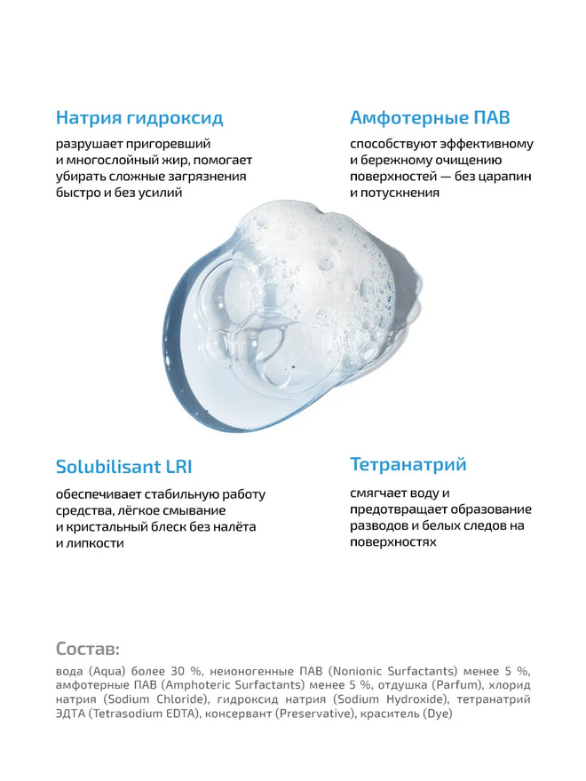 Формула на основе мягких ПАВ быстро проникает в слой загрязнений и растворяет его, обеспечивая чистоту без разводов, царапин и потери блеска. Средство начинает работать сразу после нанесения и не требует нагрева или усиленного трения поверхности.