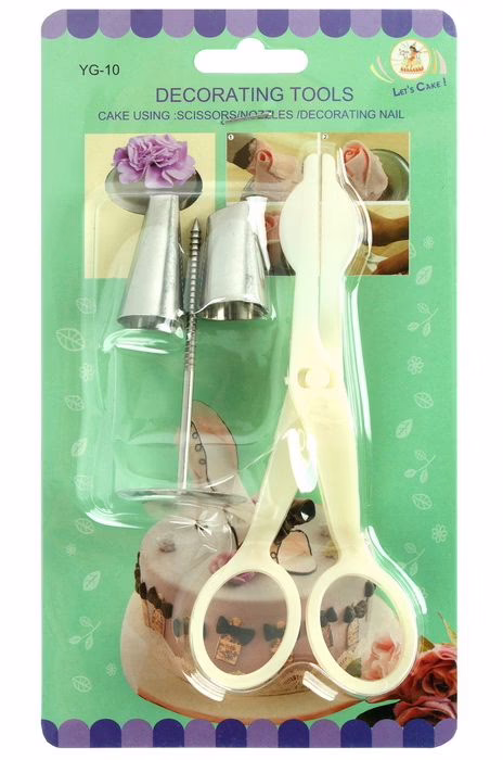 Кондитерский набор для украшения тортов состоит из ножниц, гвоздика и двух насадок. Насадки для кондитерского мешка могут использоваться в самых разных целях – для украшения тортов и пирожных, для отсаживания фигурного печенья или наполнения вкусной начинкой эклеров и пончиков. Используя насадки вы сможете быстро и аккуратно создавать различные цветы из крема.