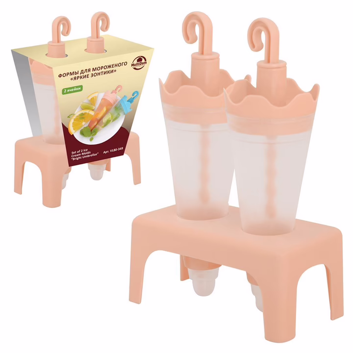 Домашний фруктовый лед или мороженое – это не только вкусное, но и полезное лакомство, ведь вы сами выбираете ингредиенты и создаете необычные сочетания вкусов. Набор "Яркие зонтики" позволяет одновременно приготовить 2 порции освежающего десерта. Формы выполнены в оригинальном дизайне, крышки-палочки удобно держать в руках, а специальная подставка позволяет ставить формочки вертикально в одном положении. Сама форма продумана так, чтобы мороженое было легко доставать.