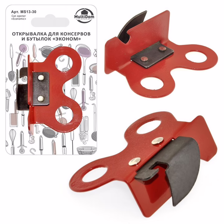 Открывалка для консервов и бутылок – незаменимое в домашнем хозяйстве приспособление. Инструмент предназначен для открывания жестяных банок с консервами и бутылок. Прочные материалы и надёжная конструкция делают открывалку практически вечной – её невозможно сломать или повредить. Чтобы открыть банку, проткните её острой частью ножа, и делайте поступательные движения. Срез получается ровным и безопасным. Компактный размер позволяет брать изделие в дорогу или на природу. Изготовлено из металла с эмалевым покрытием.