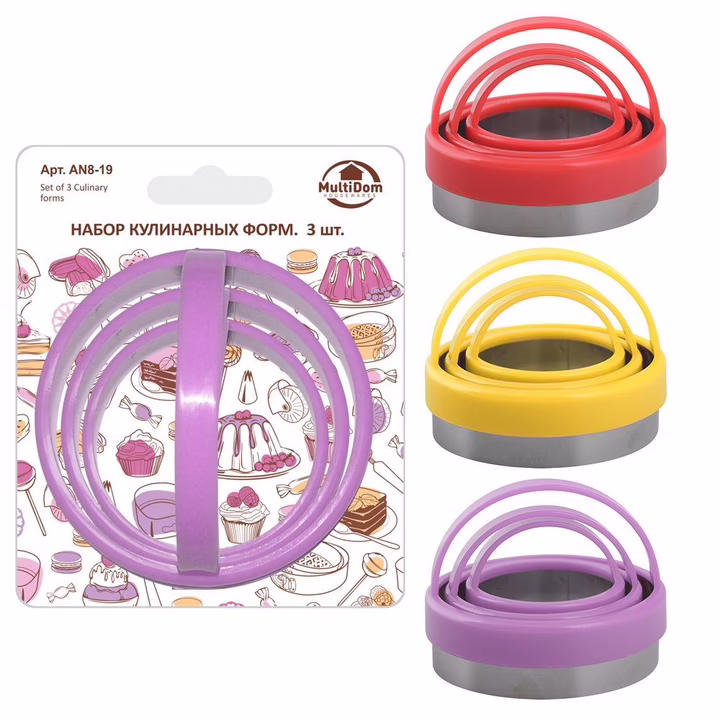 Существует множество приспособлений для домашней выпечки и работы с тестом. Для того, чтобы вырезать кружочки из теста для приготовления печенья, домашних вареников, пончиков и других изделий, используйте набор кулинарных форм с разными диаметрами. Изделия выполнены в виде круга с пластмассовой окантовкой и ручкой. Металлический край формы достаточно острый, чтобы вырезать кружок из теста, при этом он абсолютно безопасен. Кулинарная форма изготовлена из коррозионностойкой стали, окантовка и ручка из пластмассы (полипропилен).