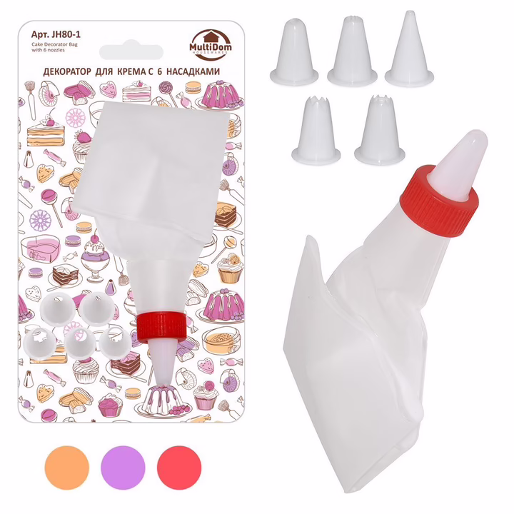 Декоратор представляет собой комплект, состоящий из кондитерского мешка и насадок. Мешок изготовлен из винила (ПЭВА), его объём 350 мл, насадки производятся из пластмассы. Приспособления идеально подходят для домашнего использования – просты в применении, занимают мало места, нетребовательны в уходе. Винил и пластмасса полностью безопасны, предназначены для многоразового использования.