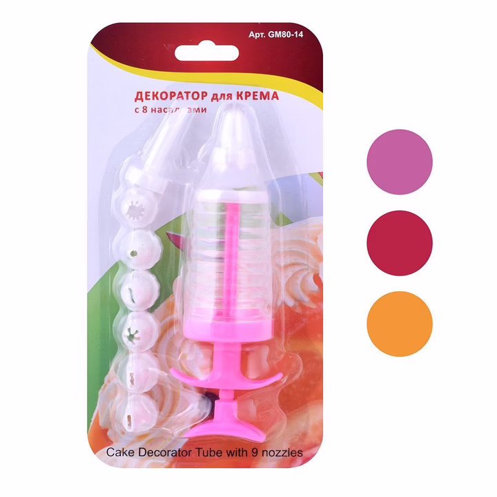 Украшайте домашнюю выпечку оригинальными кремовыми композициями с декоратором для крема с насадками. Набор состоит из специального шприца и 8 насадок. Наличие разных прорезей позволяет создавать разнообразное оформление из крема. Набор изготовлен из пластмассы, этот материал полностью безопасен, за ним легко ухаживать. После использования мойте декоратор водой с моющими средствами.