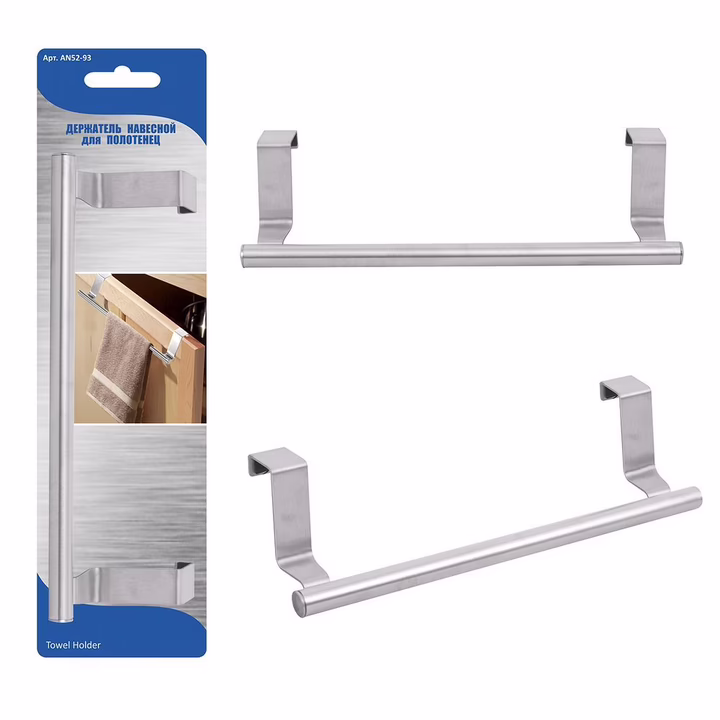 Размещать полотенца и прочие домашние предметы можно не только на крючках, ведь для этого существуют специальные держатели для полотенец. Приспособление крепится на створки шкафа, на двери, на передние панели выдвижных ящиков, смотрится стильно и подходит практически под любой интерьер. Держатель можно разместить на кухне, в ванной комнате, в кабинете и много где ещё. Конструкция выполнена из нержавеющей стали, оснащена двумя крючками для фиксации. Длина 23,5 см. Подходит для дверей и ящиков мебели толщиной 2,5 см.