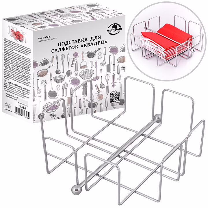 Для сервировки стола используйте стильную подставку для салфеток "Квадро". Изделие выполнено из стальной хромированной проволоки, имеет лаконичный дизайн. Хромированное покрытие гармонично смотрится в любом интерьере, не портится со временем, сохраняя свой блеск. Подставка устойчива на любой горизонтальной поверхности, всегда под рукой и занимает мало места.