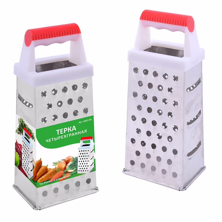 Четырёхгранная тёрка – удобное кухонное приспособление с отверстиями и насечками четырёх типов. По двум сторонам расположены крупная и мелкая тёрки для моркови, лука, яиц, картофеля. Мелкие острые отверстия нужны для получения цедры. Сторона с тремя крупными отверстиями предназначена для нарезки тонких ломтиков овощей или фруктов.