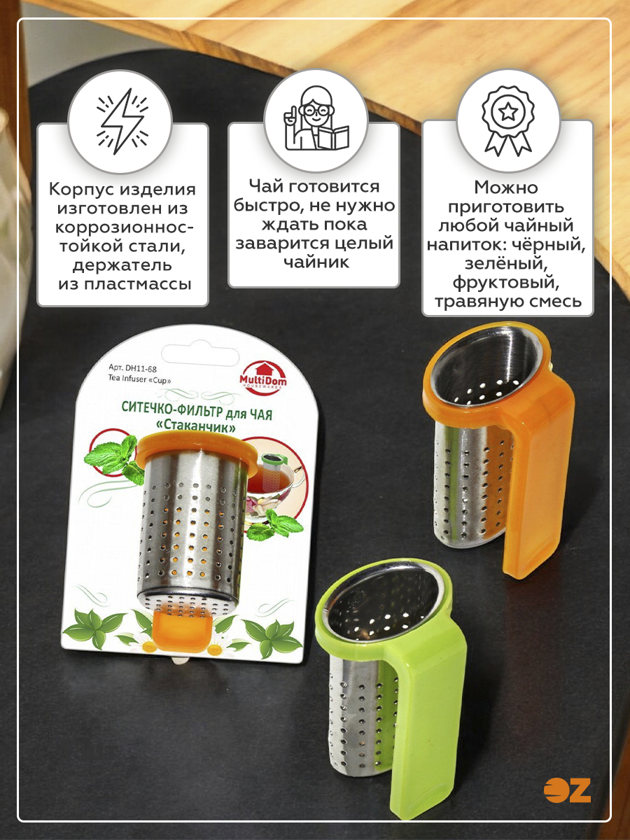 Ситечко-фильтр имеет удобную конструкцию, его можно надеть на бортик чашки и легко оттуда снять. Корпус изделия изготовлен из коррозионностойкой стали, держатель из пластмассы. Металл не вступает в реакцию с пищевыми продуктами, не оставляет привкуса. Пластик выдерживает температуру горячего чая, не портится и не выделяет вредных веществ.