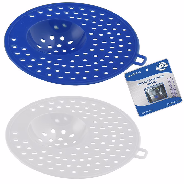 Ситечко в раковину – необходимый аксессуар для современной кухни. Ситечко предотвращает возникновение засоров во время мытья посуды. Изделие просто в установке – достаточно плотно прижать его к сливу. Мелкие отверстия беспрепятственно пропускают воду, при этом задерживают мусор. Чтобы очистить ситечко, подцепите его за край, снимите и вытряхните. Подходит для сливного отверстия диаметром от 50 до 110 мм. Изготовлено из пластмассы (полипропилен).