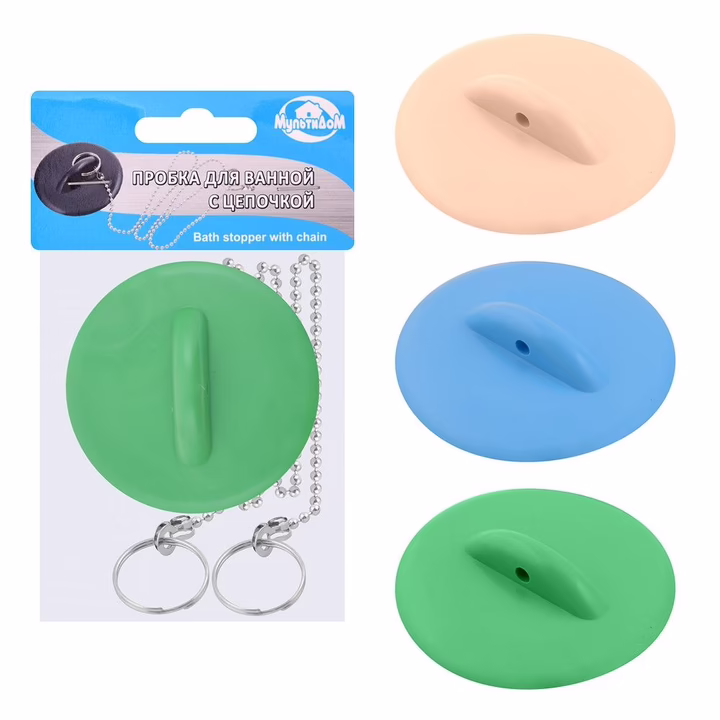 Изделие плотно перекрывает слив, для удобства использования предусмотрена цепочка.