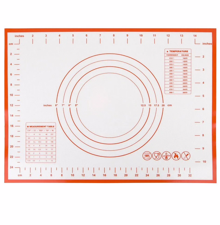 Коврик позволяет придавать коржам, печенью и пицце идеально круглую форму. Тесто не липнет при раскатке. Коврик имеет разметку из нескольких кругов разного диаметра, линейки в дюймах и в сантиметрах. Он подходит в качестве формы для выпекания и заморозки, не скользит на гладкой поверхности, не впитывает запахи и легко моется.